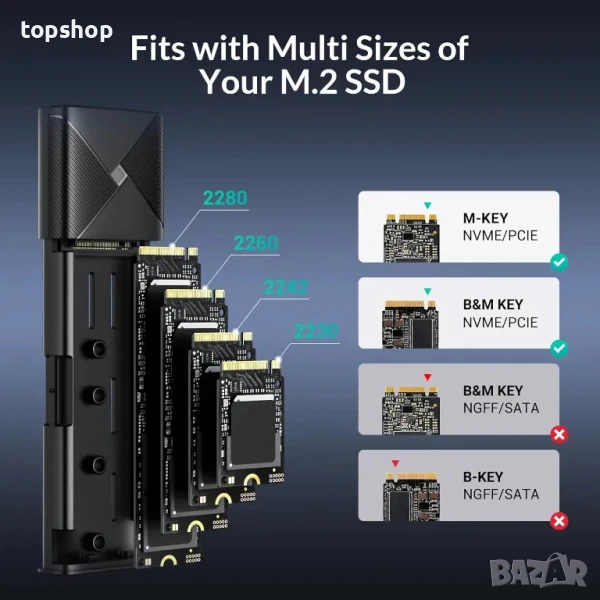 Само M.2 NVMe: Проектиран единствено за NVMe твърди дискове с M ключ, осигуряващ бързи и ефективни скорости на трансфер на данни. Не е съвместим с NGFF SATA SSD