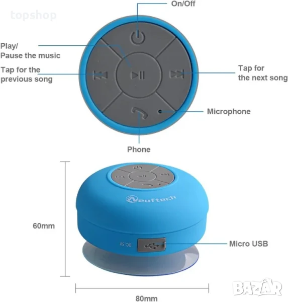 НОВА мини блутут колонка Neuftech Мини преносим водоустойчив безжичен Bluetooth стерео високоговорител за душ с вендуза и вграден микрофон Bluetooth 3.0 (син)