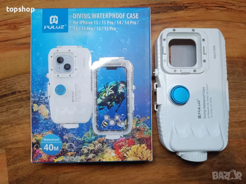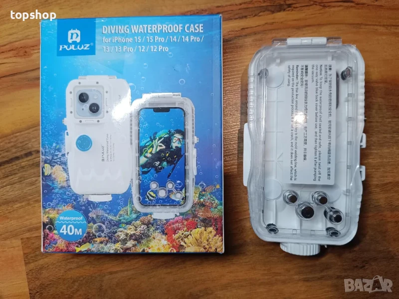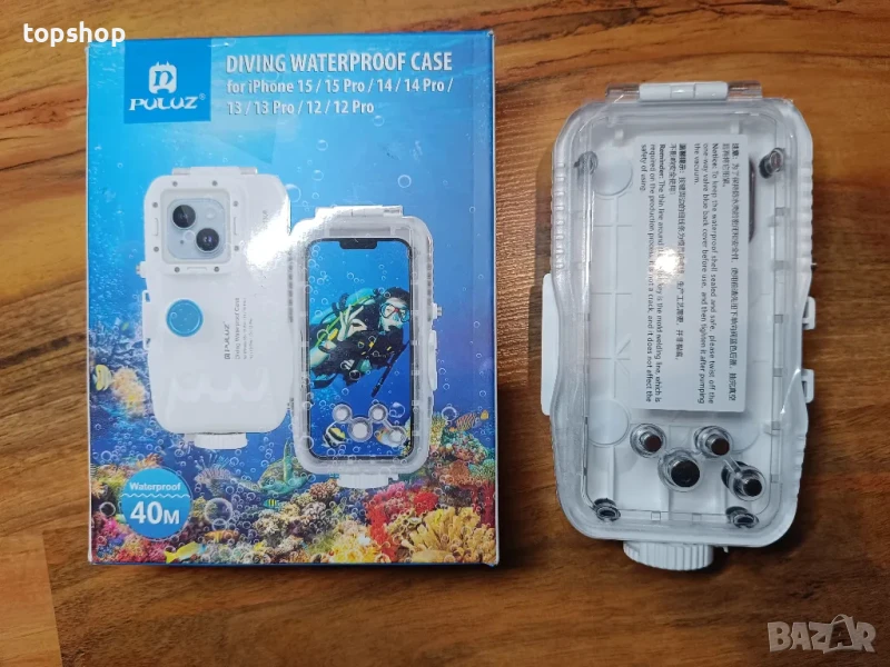 Водоустойчив калъф PULUZ 40M/130FT за iPhone 15/15 Pro/14/14 Pro/13/13 Pro/12/12 Pro, защитен корпус за подводно гмуркане с еднопосочен клапан (бял)