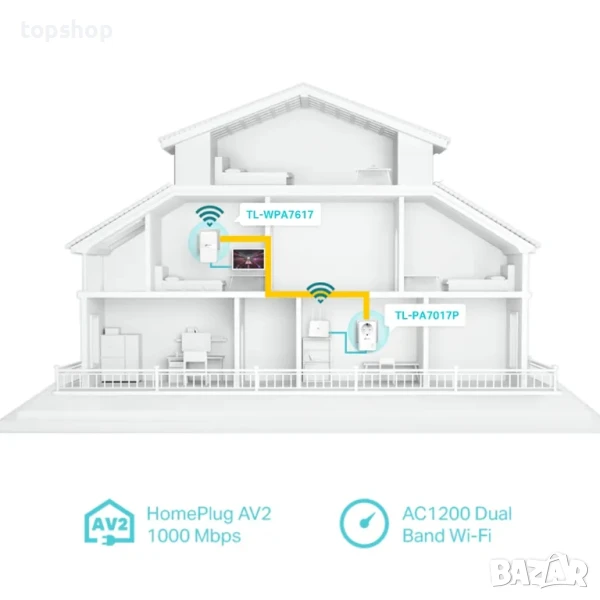 Използвайки усъвършенствана технология HomePlug AV2, TL-WPA7617 KIT осигурява стабилна и високоскоростна WiFi, а също и кабелна връзка, осигурявайки предаване на данни до 1000 Mbps през електрическото окабеляване за обхвати до 300 метра.