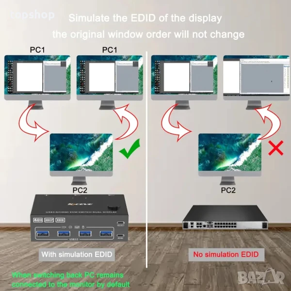 【С функция за EDID емулатор】Този KVM превключвател с двоен монитор с EDID емулатори във всеки входен порт поддържа компютрите винаги с правилна информация на дисплея, когато превключите обратно. съвместим с различни компютърни системи, като Windows10 / 8.1 / 8 / 7 / XP / Vista, Mac OS, Linux, Chrome OS.
