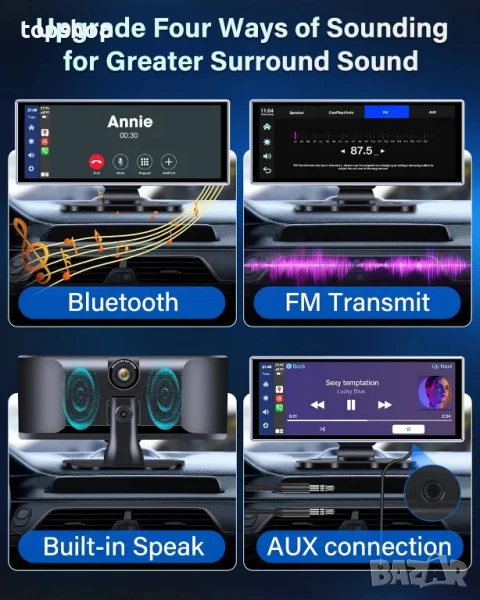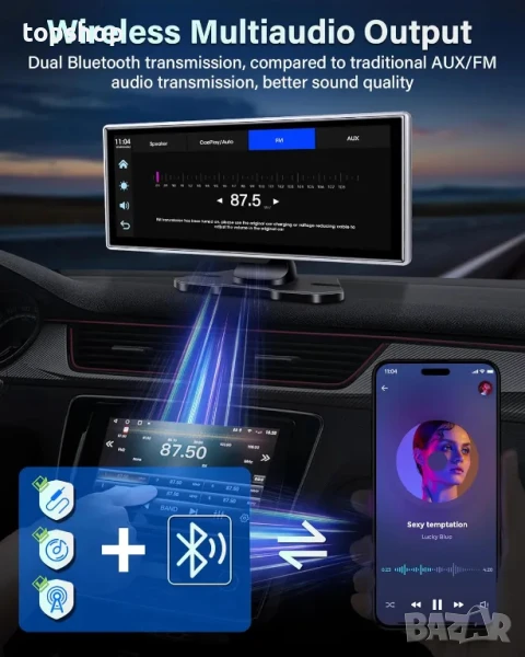 Дизайнът с двоен Bluetooth подобрява изживяването при шофиране: С най-новата технология за двоен Bluetooth можете едновременно да свържете Apple Carplay и оригиналните високоговорители на автомобила чрез Bluetooth, така че да контролирате силата на звука на музиката безжично, да отговаряте на повиквания и да правите разговори със свободни ръце без смущения, докато шофирате. Можете също да използвате AUX или FM предаване, за да възпроизвеждате аудио сигнали през високоговорителите на автомобила за още по-силно звуково изживяване.