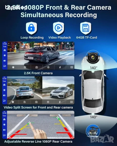 CARPLAY DRIVEPLAY С ПРЕДНА И ЗАДНА КАМЕРА: Безжичният екран за carplay разполага с 2,5K предна камера и 1080P задна камера за едновременни записи. Предлага много по-ясни изображения, които улавят регистрационните номера от разстояние и записват повече подробности за шофирането. 140°+140° широкоъгълен обектив за намаляване на слепите зони и заснемане на повече сцени на пътя.