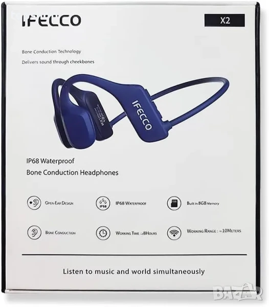 НОВИ IFECCO водоустойчиви слушалки с костна проводимост, IP68, Bluetooth, ,8GB Вградена памет, MP3, безжични. Спортни слушалки с отворено ухо за плуване, бягане.