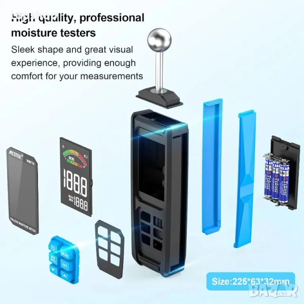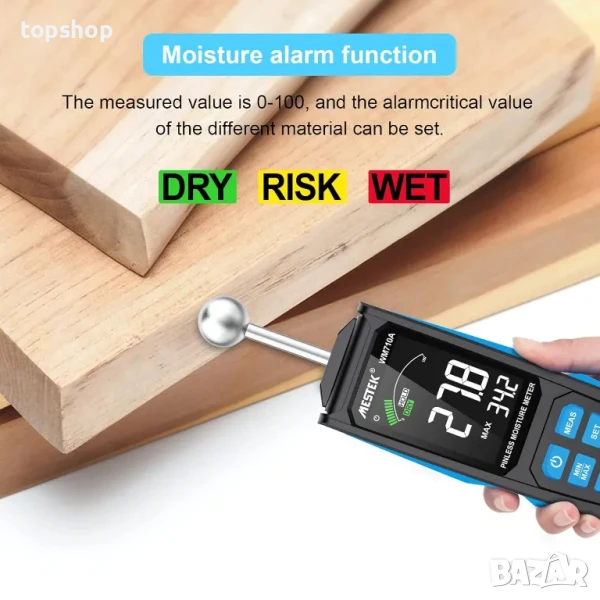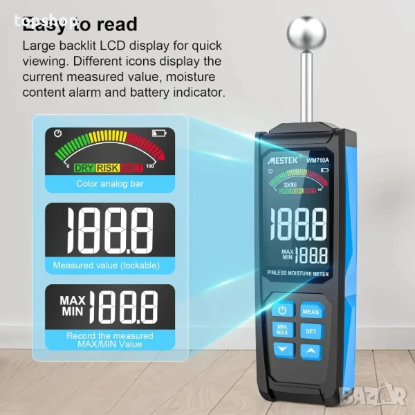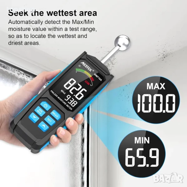 ЧИСТО НОВ Mestek WM710A цифров влагомер за материали и дърво със сфероид, LCD дисплей (WM710A)