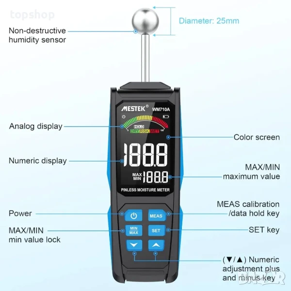 Безразрушителният влагомер MESTEKWM710A измерва влагата с помощта на сензорна дълбочина до 20-40 мм в строителни материали, дърво, подове и др. Той се използва за локализиране на влагата и е подходящ за изпитване на строителни материали преди нанасяне на следващия слой материал за довършване на стени, подове и др.
