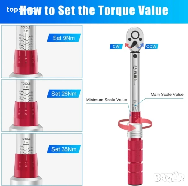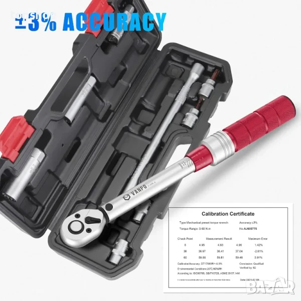 Динамометричен ключ / Тресчотка Vanpo 3/8 инча, 5-60 Nm, ±3 процента точност с 250 mm удължител...