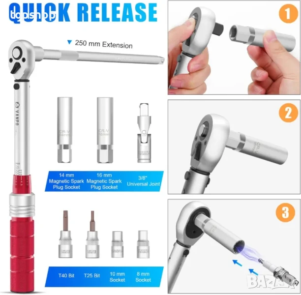 Динамометричен ключ от 9 части 3/8 инча: Този комплект съдържа 1 x 3/8 инчов динамометричен ключ, 1 x 250 mm удължителен прът, 1 x универсален шарнир 3/8 инча, 2 x магнитен гнездо за запалителна свещ 14 mm/16 mm, 2 x къса гайка 8 mm/10 mm, 2 x накрайник T25/T40. 250 mm удължителен прът и магнитните гнезда за свещи са по-полезни за смяна на свещта. Често се използва при ремонт и поддръжка на велосипеди, автомобили и мотоциклети.