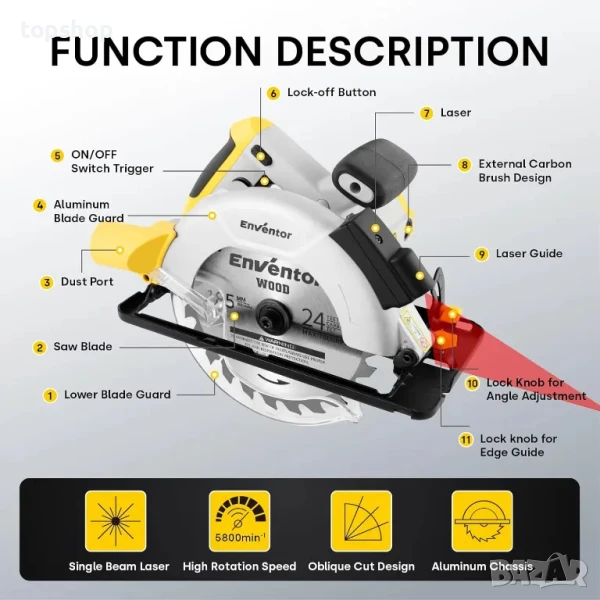 Нов Циркуляр Enventor, 1200 W 5800 RPM електрически циркуляри с мотор от чиста мед с лазерен водач..
