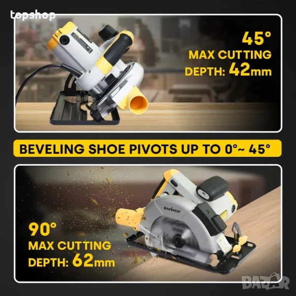 ➤【Регулируема дълбочина и ъгъл на рязане】Електрическият циркулярен трион ENVENTOR ви позволява да регулирате ъгъла на рязане според нуждите, вариращ от 0° до 45°. максималната дълбочина на рязане може да достигне 62 mm (90°) и 42 mm (45°). Регулирането на ъгъла и дълбочината може да ви помогне гъвкаво да се регулирате в дървообработването.