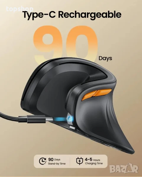 Акумулаторна ергономична мишка: Вертикалната Bluetooth мишка има вградена литиево-йонна батерия от 500 mAh, която може удобно да се презарежда с помощта на включения кабел Type-C
