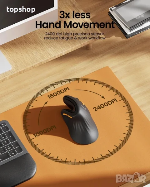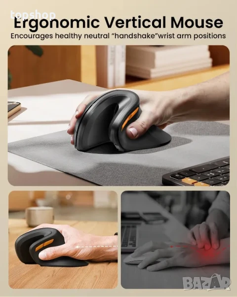 Ергономичен вертикален дизайн: Ергономичната безжична мишка поддържа китката ви естествено права, поставяйки предмишницата и китката ви в по-естествена и спокойна позиция, което може да намали общата умора в сравнение със стандартната мишка. Топли съвети: Съветваме ви да отпуснете дланта си и да държите мишката естествено, когато използвате вертикална мишка