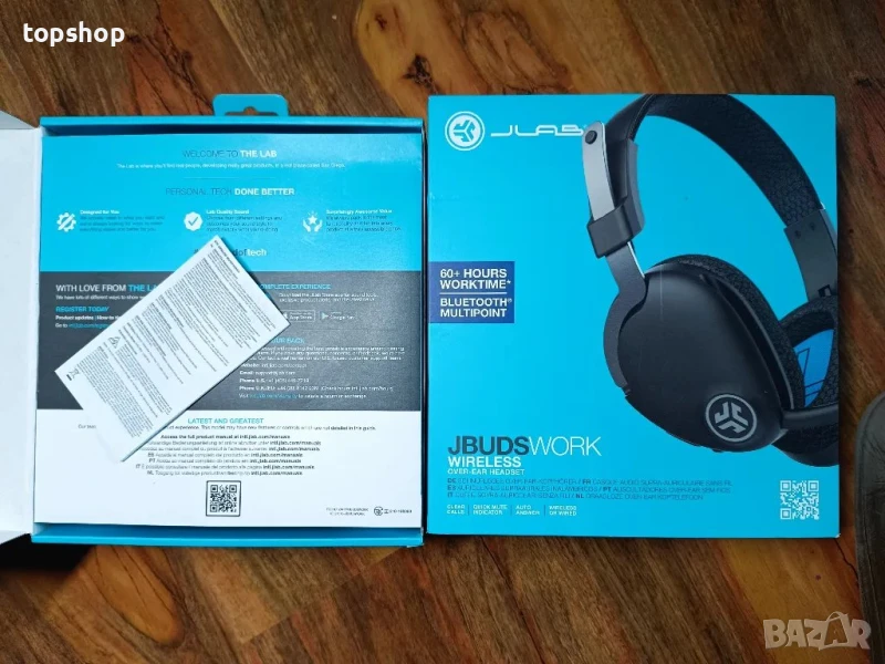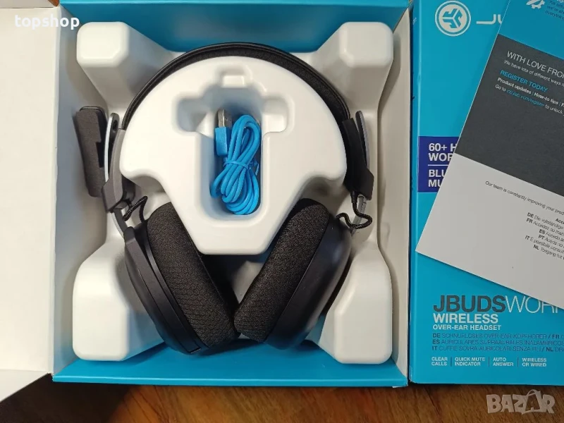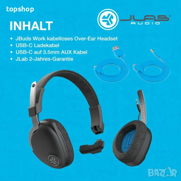 ? ВКЛЮЧВА: Безжични слушалки за уши JBuds Work, кабел за зареждане Type-C, кабел Type-C към 3,5 мм AUX за кабелна употреба, двугодишна гаранция на JLab.