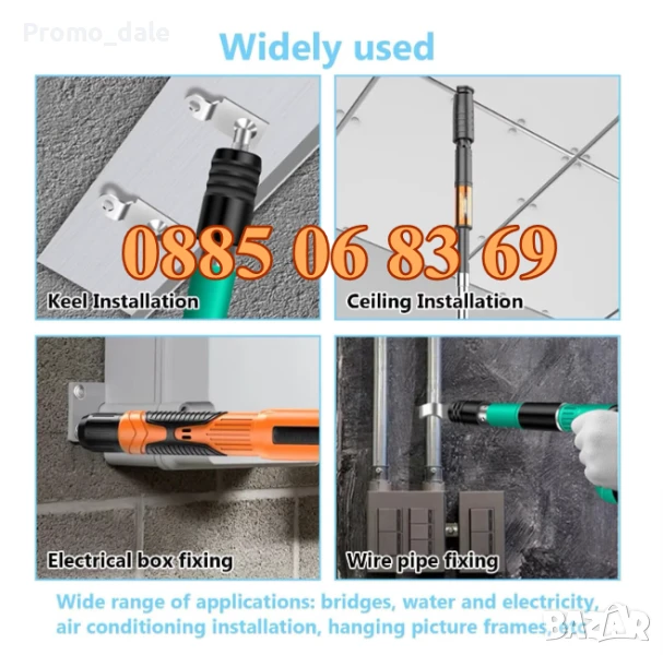 Стоманени пирони за тавани, леки стоманени скелета, тръбни инсталации, водопроводни инсталации, врати и прозорци, климатизация, наблюдение и окачване на рамки за снимки.