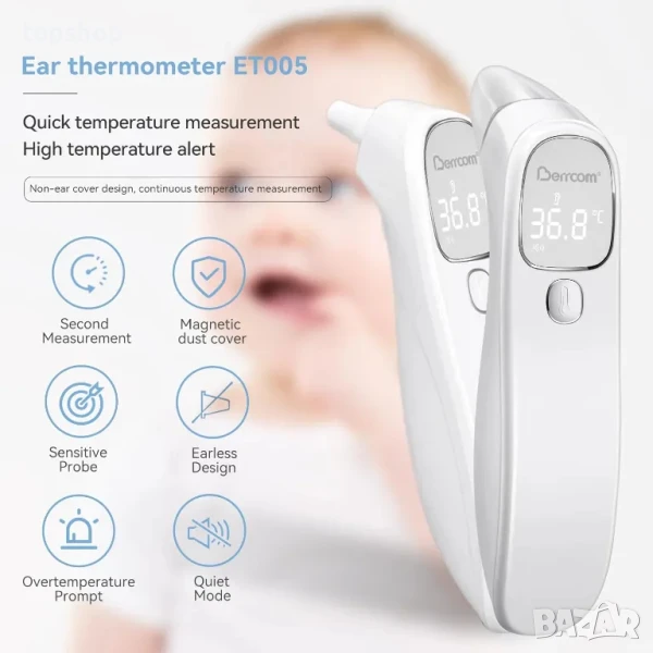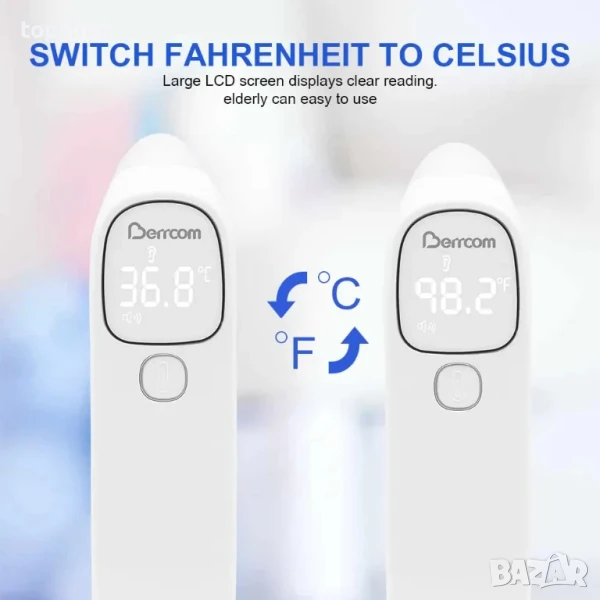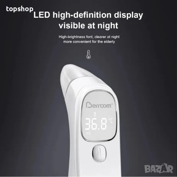Безопасен и удобен за всички възрасти: Термометърът за чело и ухо Berrcom е компактен, преносим и лесен за носене, което го прави подходящ за използване у дома, в болници, училища, хотели и други обществени места; предназначен за всички възрасти, той осигурява точен, бърз и лесен начин за наблюдение на температурата във всяка настройка