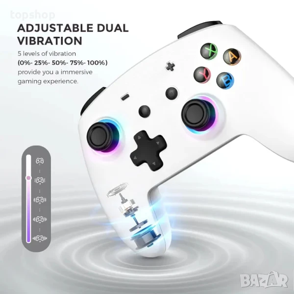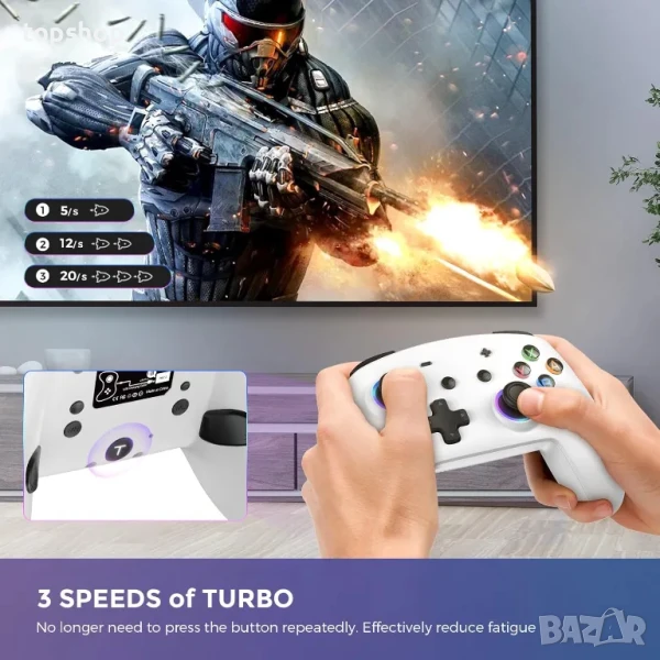 Регулируеми вибрации и турбо функции: Безжичният контролер ECHTPower е оборудван с двоен мотор, общо 4 степени на вибрация (100%/70%/30%/0%) могат да се регулират според вашите нужди. С турбо функцията можете да атакувате без никаква пауза, когато играете игри като The Legend of Zelda, която ви предлага убедително игрово изживяване. Този превключвател има и 3 турбо скорости: 5 изстрела/s, 12 изстрела/s, 20 изстрела/s.