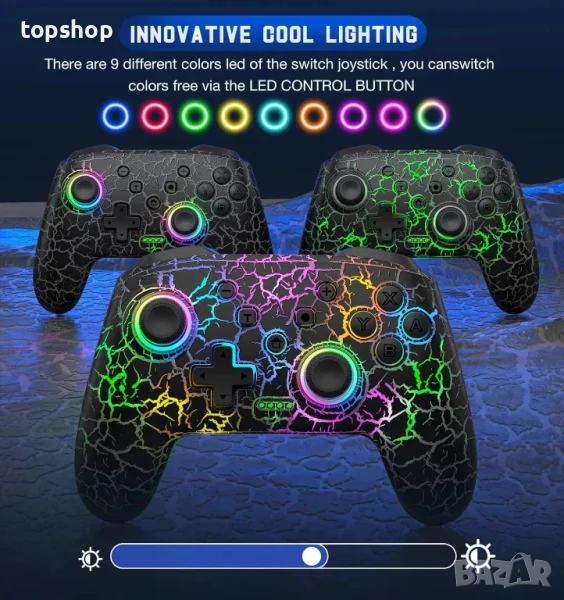 Уникален кракнат дизайн и персонализирани светлинни ефекти: Вашите контролери за превключване ще имат регулируеми LED светлини в 6 различни цвята, Можете да превключите цвета, който харесвате, по всяко време. Ако изберете червено, ефектът му ще бъде като гореща "магма"; Ако изберете синьо, то ще бъде като блестяща светкавица! Купете сега, запалете любимата си светлина през нощта, ще бъдете най-готините сред приятелите си