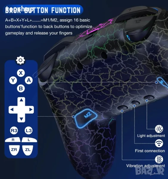 Съвместим с Switch Console/Ios/Android/PC: Надстроените контролери за превключване не само са съвместими с конзолата за превключване, но също така се предлагат за ios/android/pc. Контролерът за игри поддържа безжична връзка за игра на игри за превключване, iOS MFI игри (IOS 13.0 и по-нови), Android HID игри; също може да бъде чрез USB кабелна връзка с компютър, за да поддържа игра на X-Input и Steam игри. (Windows 7 и по-нова версия), Ако имате нужда от Bluetooth приемник, за да се свържете с вашия компютър, можете да изберете модела Blue·tooth