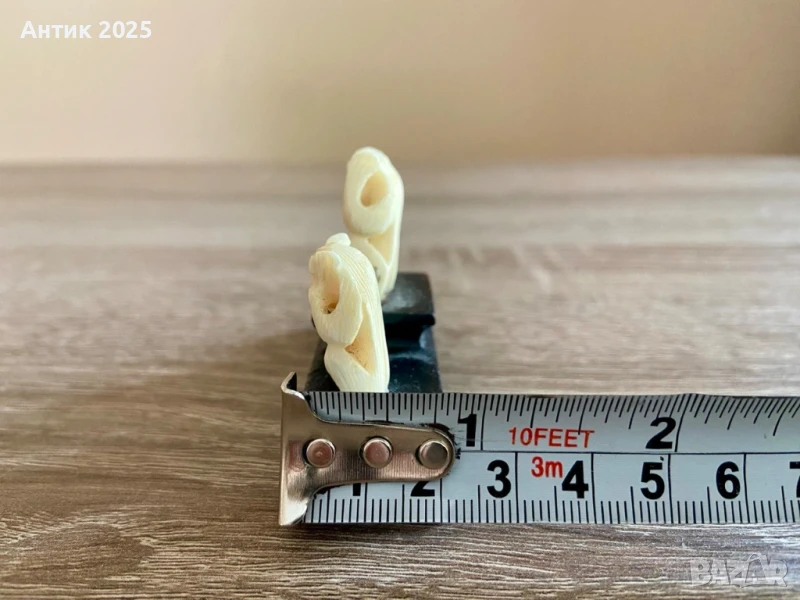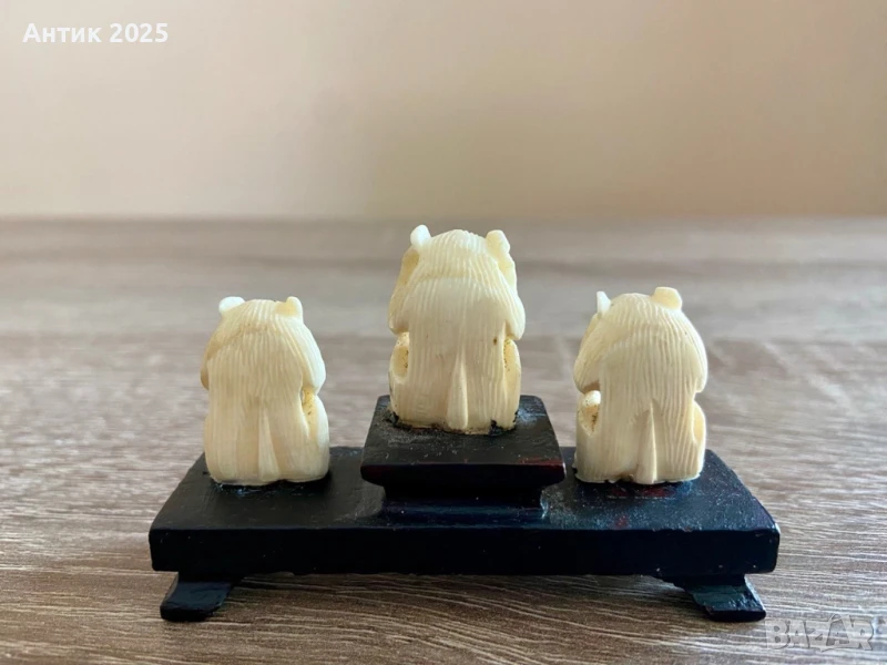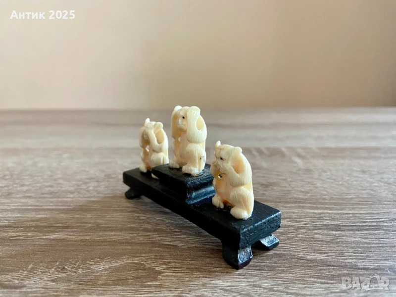 Тези фигури от слонова кост изобразяват известния мотив на трите мъдри маймуни, символизиращ принципа "не виждай зло, не чувай зло, не говори зло". Едната маймуна закрива очите си, другата закрива ушите си, а третата закрива устата си. Това изображение е широко използвано в различни култури като напомняне, че понякога е най-добре да избягваме негативните влияния.