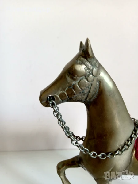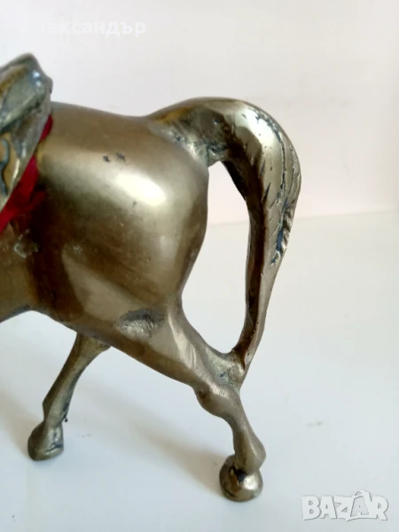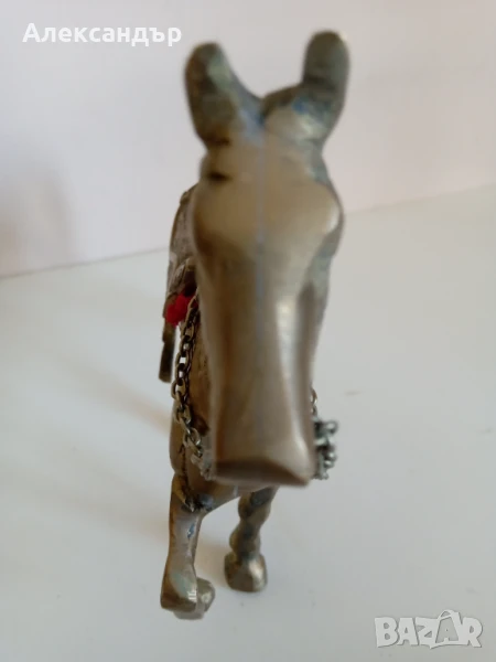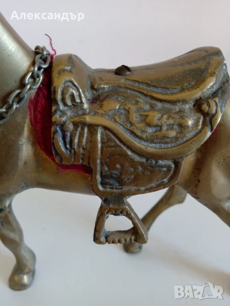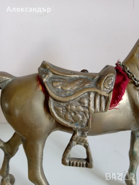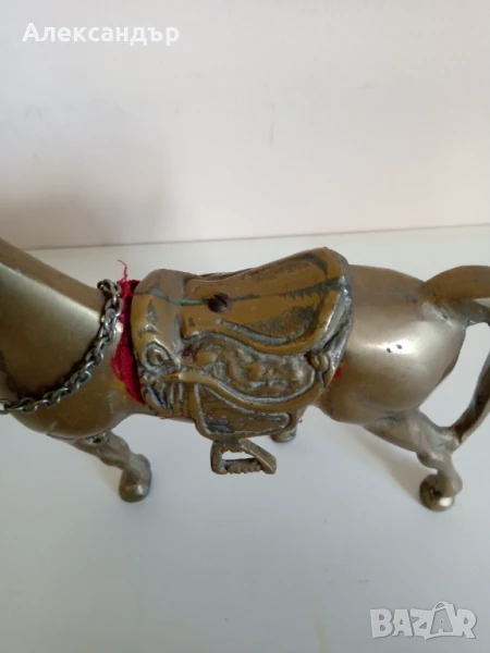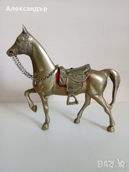 Голяма и много красива статуетка на кон.Ръчно гравирани тялото и седлото. Дължина 18,5 см. Височина 17 см. Тегло 720 грама.