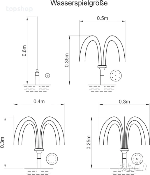с включените щрангове и комплект дюзи могат да се създадат 4 различни модели на пръскане или може да се свърже маркуч. дебитът на помпата е регулируем.
