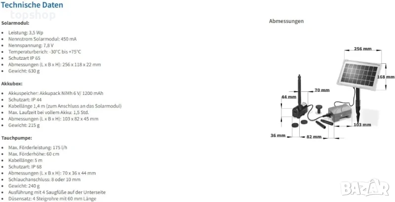 соларен модул кристален: 3,5 Wp. Съхранение на батерии: батериен пакет NiMh 6 V / 1200 mAh - помпа макс. Дебит: 175 л/ч - Макс. Височина на доставка: 60 см – комплект дюзи: 4 щранга с дължина 60 мм – 4 сменяеми дюзи