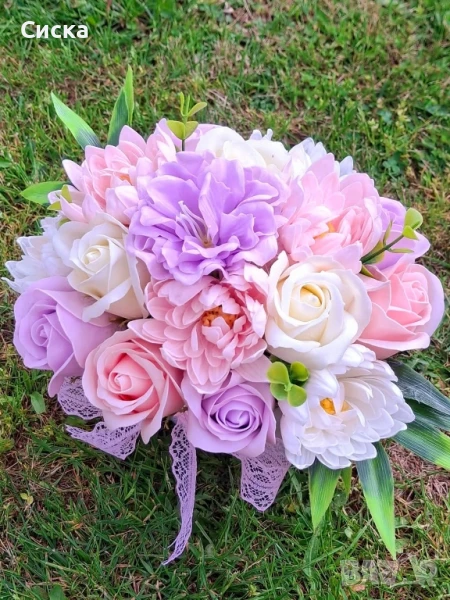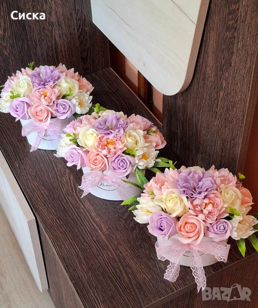 Нежен букет със седемнадесет сапунени цветя от пластичен сапун в бяла кашпа → Обява 50494894