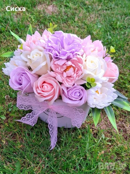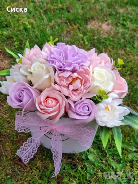 🌸🦋🌸🦋🌸Ново🌸🦋🌸🦋🌸 Нежен букет със седемнадесет сапунени цветя от пластичен сапун в бяла кашпа 🦋