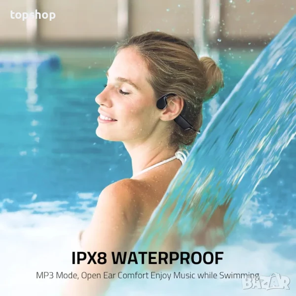 Водоустойчив ефект IPX8 - Нашите слушалки с костна проводимост са подходящи за любители на плуването, които могат да издържат 12 фута/3,6 метра вода. Можете да запазите любимата си музика и да й се наслаждавате в mp3 модел, когато плувате. Подходящ е и за други спортове като бягане, туризъм и т.н.