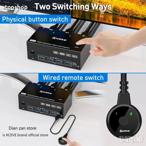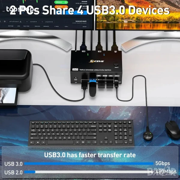 НОВ ТЕСТВАН KVM превключвател за 2 компютъра към 3 монитора + KCEVE USB 3.0. HDMI + DisplayPort 8K..