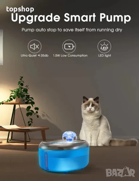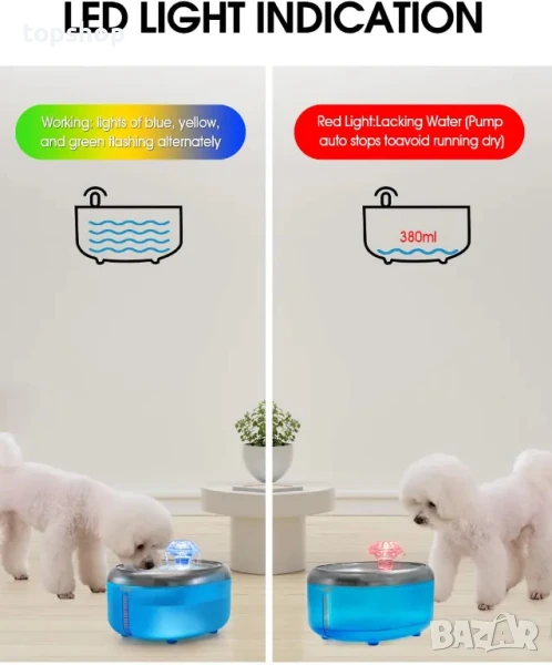 Ултратиха и интелигентна помпа - Помпата WOPET поддържа шум под 35dB по време на работа, което не пречи на вас и вашия домашен любимец да почиват. Тя е много енергийно ефективна и издържа по-дълго от всяка друга помпа на пазара. Синята, зелената и жълтата светлина мигат последователно, когато помпата работи. Интелигентната помпа ще светне с червена светлина и ще се изключи автоматично за самозащита при недостиг на вода.