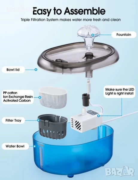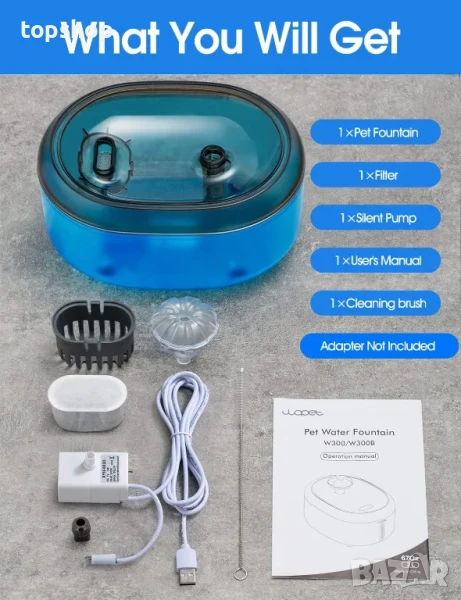 Лесен за сглобяване и почистване - Фонтанът за вода за котки WOPET W300B е лесен за сглобяване и разглобяване за почистване и подмяна. Забележка: Фонтанът за домашни любимци W300B не се предлага с контакт. Препоръчително е да използвате адаптер 5V, 1A или power bank за работа.