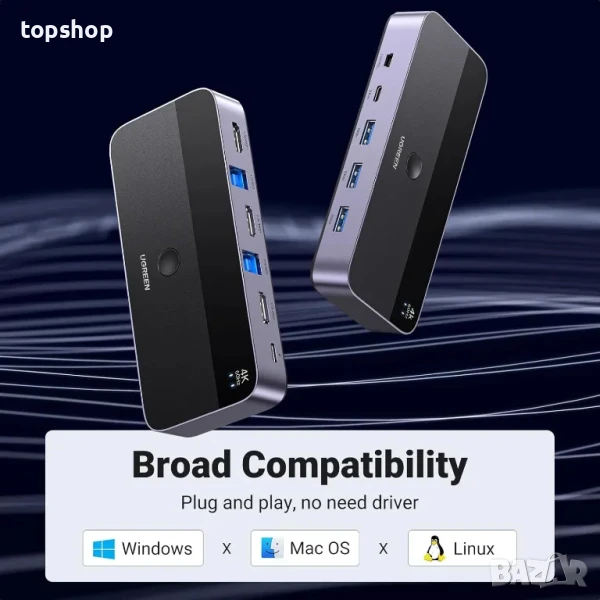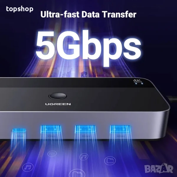 Споделяне на 4 USB 3.0 порта: UGREEN KVM превключвателите имат 3 USB-A порта и 1 USB-C порт за споделяне на USB флаш устройства, принтери, мобилни твърди дискове, U диск и други USB 2.0 и USB 3.0 устройства. USB 3.0 предлага скорост на трансфер на данни до 5Gbps, докато USB 2.