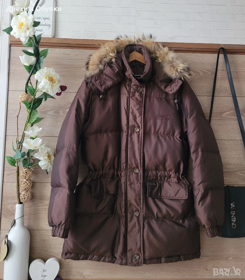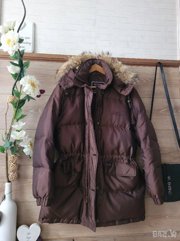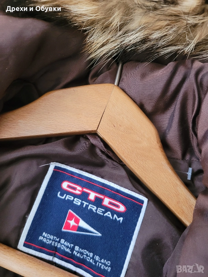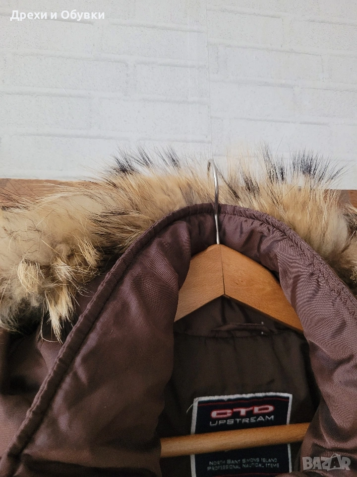 Дамско зимно яке GTD UPSTREAM. Актуален тъмно кафяв цвят, с естествен косъм лисица на качулката. Якето е топло, удобно и подходящо за студените зимни дни. Моделът е с вталяваща линия, която красиво подчертава силуета, и с практично закопчаване цип и копчета. Разполага с два джоба също със закопчаване ципове и капачета отгоре. Ластично пристягане в талията за допълнителен комфорт. Качулката с естествен лисичи косъм придава луксозен и стилен завършек.( сваляема посредством цип). Качествено изпъкващо бродирано лого. Размер Л Гръдна до 114см, дължина 73см Още снимки в коментар. Като ново! Реалната е над 450лв/230€ Символична цена 85€