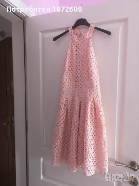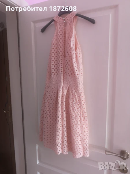 Лятна дамска рокля с рязана бродерия в размер S. Цветът на роклята е розов. Използвана е, но в много добро състояние. В бюста е вталена, надолу свободна. Няма еластичност. Гърба не е цял.