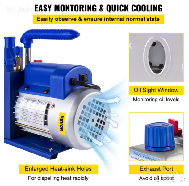 ***Тази вакуумна помпа е устройство за постигане на вакуум чрез изпомпване на газове от запечатан контейнер. Особено подходящ за битови климатици, поддръжка на автомобили, вакуумно опаковане и почистване на хладилници. Разполага с дизайн с евакуация и въртящи се лопатки и лека конструкция от лят алуминий, идеална за дълъг експлоатационен живот.Тази ротационна вакуумна помпа е снабдена с прозорец за наблюдение на нивото на маслото, за да се следи бързо нивото му и да се предотврати недостигът му.
