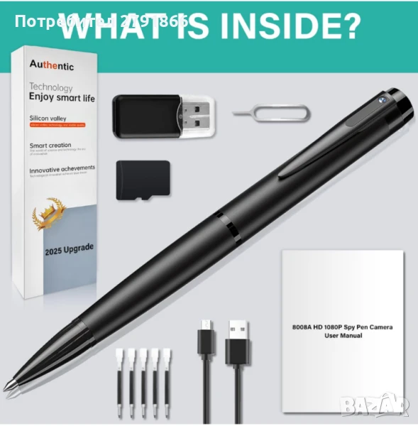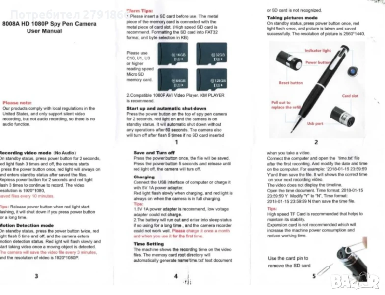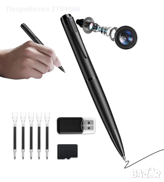 • Скрита камера с химикалка. Осигурява 5 резервни пълнителя с мастило.