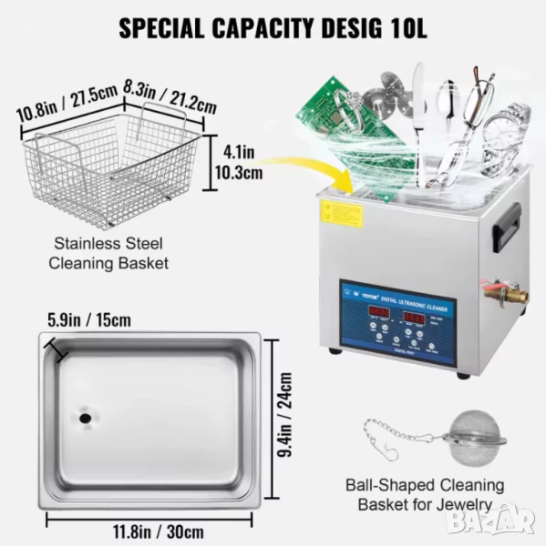 Капацитет на резервоара: 9,6–10 л (Тъй като дъното на ултразвуковата почистваща машина има извита повърхност, действителният обем е по-малък.)
