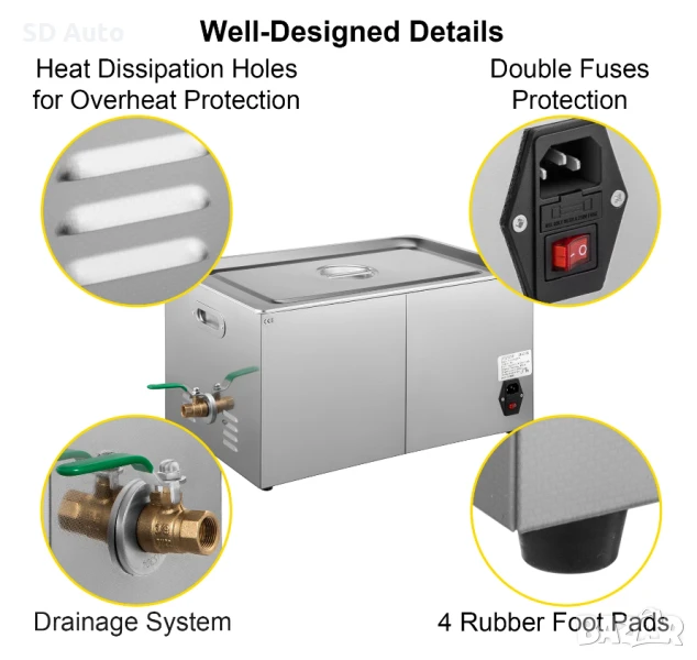 ***Този ултразвуков почистващ апарат за части е изработен от неръждаема стомана 304, разполага с капак за намаляване на шума и вградени дръжки от двете страни