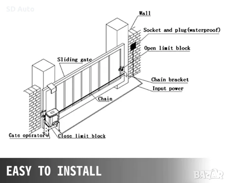 ***Механизмът за плъзгащи се порти е проектиран за лесен монтаж, без да е необходим електротехник или заваряване. Той се използва широко в тежкотоварни плъзгащи се врати с максимално тегло от 600 кг и максимална дължина 12 метрана панел на вратата. Този отварач за порти може да се използва за много приложения, включително хотели, фабрики, училища, частни домове, ферми, ранчота и др. Комплектът включва всичко необходимо за монтаж.Оборудван с мотор от чиста мед и здрава основа, той може да гарантира, че портала ще се отваря плавно със скорост от 13 м/мин.Оборудван с две безжични дистанционни управления за отваряне, затваряне и спиране с обхват до повече от 30 метра.Оборудван е с водоустойчив и прахоустойчив корпус.