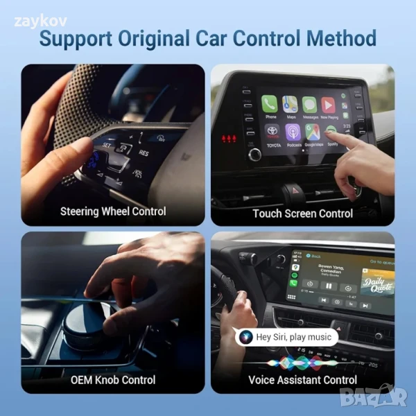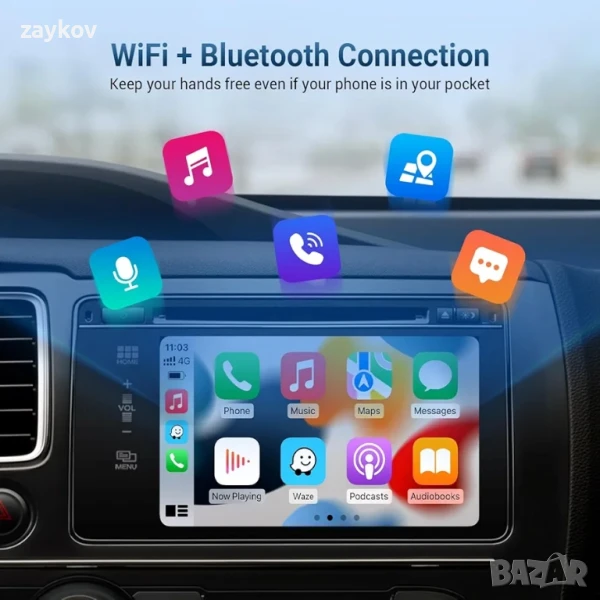 Широка съвместимост: Безжичният CarPlay е наличен на iPhone с iOS 10 и по-нова версия. Безжичният Android Auto работи с телефони с Android, работещи с Android 11 и по-нова версия. Съвместим е с над 800 модела автомобили от 2016 г. нататък с фабрично окабелен CarPlay или фабрично окабелен Android Auto. ЗАБЕЛЕЖКА: Не е съвместимо с модели BMW, Tesla. Ултратънък и лек дизайн, не заема много място в колата. Може да бъде скрит в колата или залепен някъде на централната конзола.