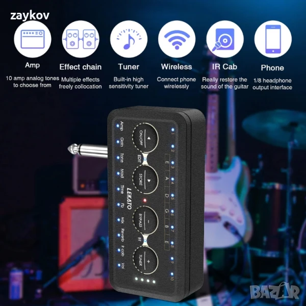 Усилвателят за слушалки „всичко в едно“ LEKATO предлага разнообразие от ефекти (включително overdrive, distortion, CHORUS/PHASER, delay и reverb), 10 моделиращи усилвателя и 10 модела кабинети с импулсен отговор (IR).
