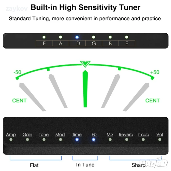 за китара, усилвател за слушалки, може да се използва непрекъснато в продължение на 5 часа, когато е напълно зареден (зарежда се чрез USB). Чувствителен и точен тунер, подходящ за 6-струнни електрически китари.