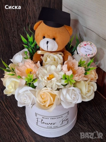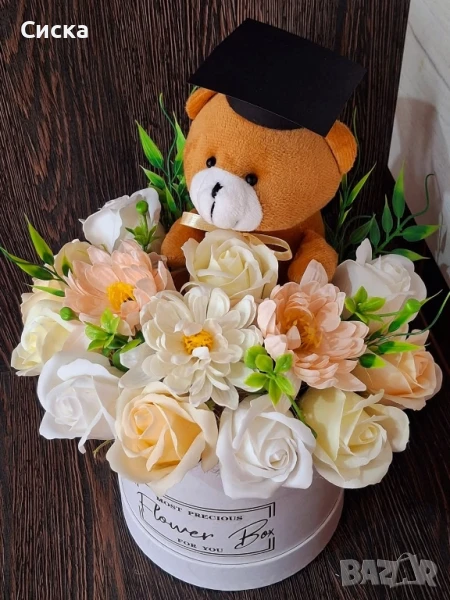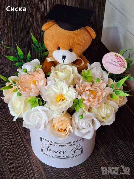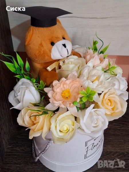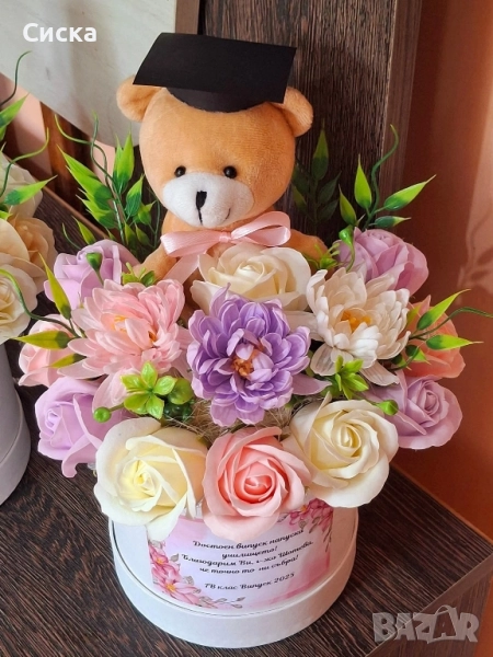 ⚘️Букет със сапунени цветя от пластичен сапун и плюшено мече за бъдеща абитуриентка → Обява 50498868