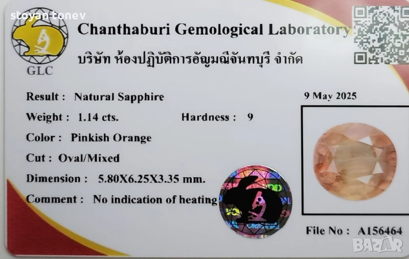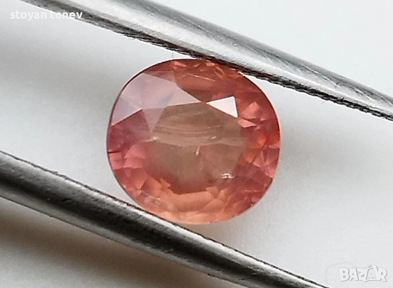 Естествен Падпараджа сапфир с тегло 1.14кт. и произход Танзания. Чистота SI малки видими включения. Цвета е розово оранжев. Овална форма с размери: 6.25 x 5.80 x 3.35 mm.