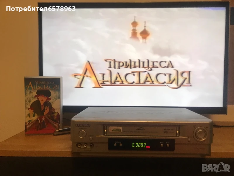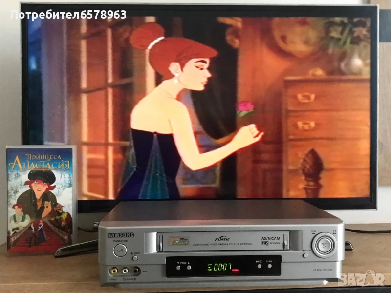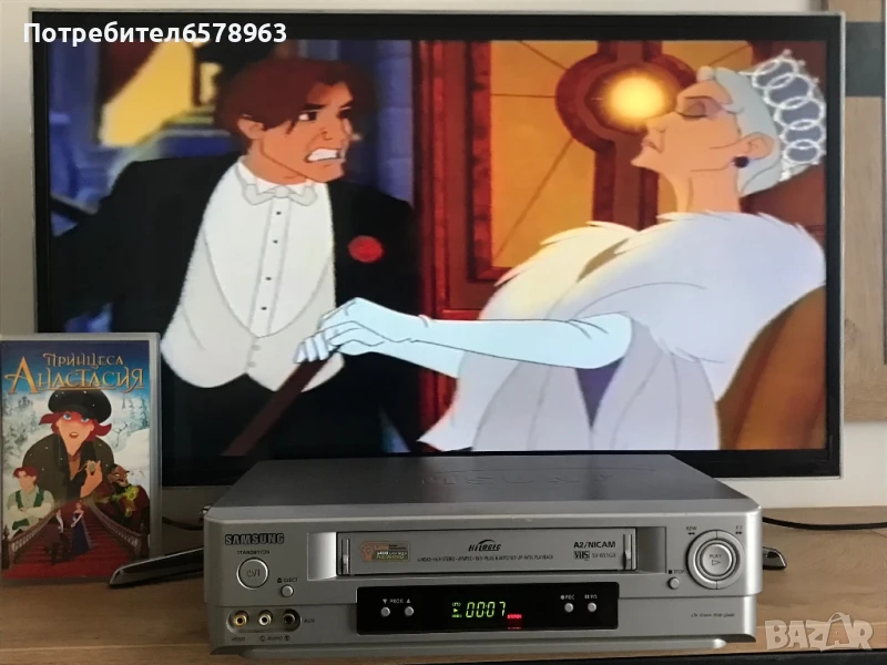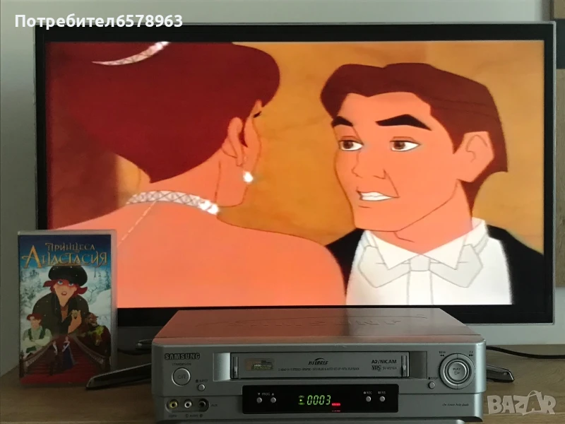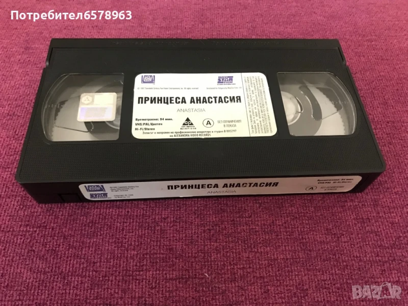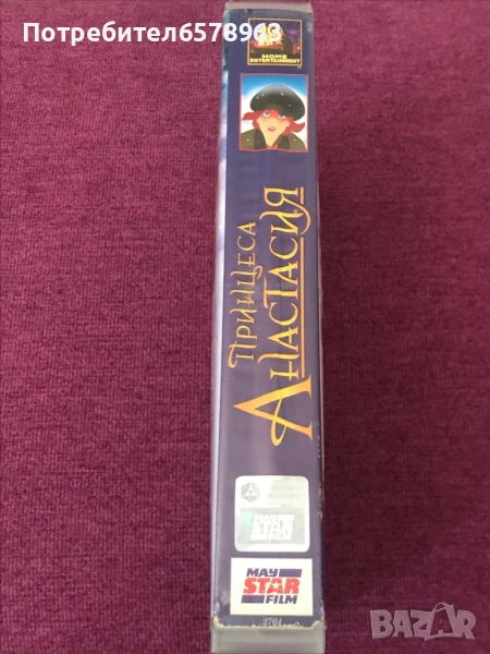 Продавам хитовата анимация от 90-те “ Анастасия “ . Видеокасетата е отлично запазена с два стикера и холограмен стикер , в прозрачна кутия . Няма намачкана лента , работи перфектно отначало до край . Отличена картина и кристален звук . Озвучен на български език . Времетраене : 94 минути ( 1 ч. и 34 м. ) Създаден 1997 , копиран на
