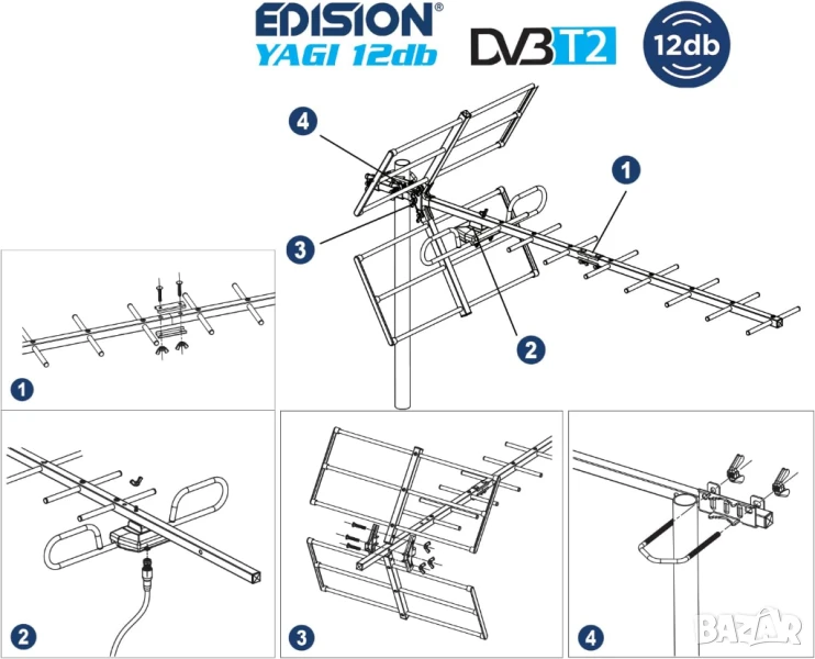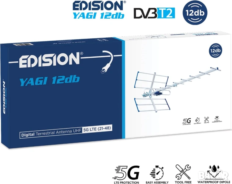 Антената EDISION YAGI 12db 5G 21-48 е за приемане на ефирни цифрови телевизионни канали от 21 до 48 UHF. Тя осигурява усилване от 12db и в същото време намалява смущенията от 4G & 5G LTE честоти. Отличава се с висококачествена алуминиева конструкция и качествени синтетични материали, заедно с "гайки" тип пеперуда за лесно и безопасно сглобяване. В комбинация с малкия си размер, тя е идеална избор за всяка инсталация в точка, която има лесно приемане на цифров наземен сигнал.