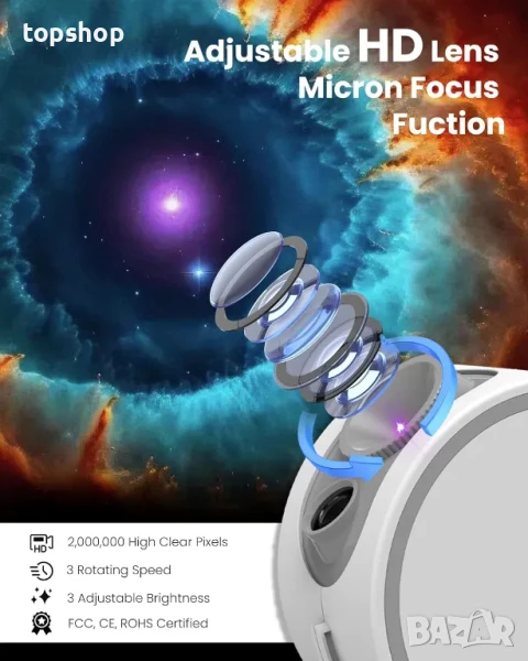 【Идеален подарък】Този галактичен светлинен проектор ще се хареса на децата като нощна светлина, както и на младата публика. Подходящ като декорация на стая, помощник за сън и създател на атмосфера. Силно препоръчително, ако харесвате нощното небе и вселената, ще бъде приятно и релаксиращо да пускате музика, когато светлинният проектор е включен.