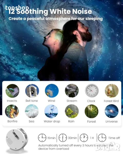 【12 бели шума и таймер за заспиване】Докато 12 допълнителни бели шума могат да ви помогнат да заспите, автоматичен таймер от 15/30/60 минути може да помогне за автоматично изключване на проектора, без да се притеснявате, че ще забравите да изключите устройството. 3 настройки за ниво на яркост за използване през нощта и защитават качеството на вашия сън, вас и вашето семейство.