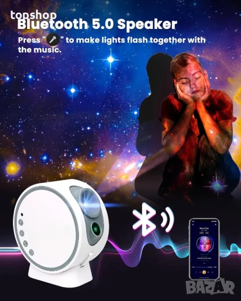 【Bluetooth високоговорител и синхронизиране на музика чрез дистанционно управление】Вграден BT високоговорител, свързване към мобилен телефон. С помощта на дистанционното управление изберете светлинния ефект, който предпочитате да търсите. Ако натиснете бутона "Music Sync", проекторът непрекъснато бие и променя цвета си в ритъма на музиката, която възпроизвеждате. Светлината на небето и музиката заедно осветяват стаята и я правят жива и релаксираща.